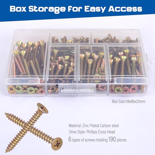 AMLOOPH M3.5 Wood Screws Assortment, 190pcs Self Tapping Screws For Wood Decking 16/20/25/30/35/40mm Small Assorted Zinc Plated Drywall Concrete Screw Set Mixed, With Plastic Box