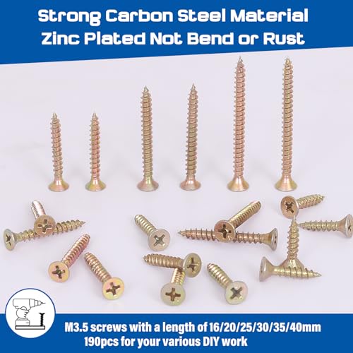 - 【Assorted Screws Pack】Our thread diameter 3.5mm wood screws set includes 40pcs m3.5x16mm, 35pcs m3.5x20mm, 30pcs m3.5x25mm, 25pcs m3.5x30mm, 30pcs m3.5x35mm, 30pcs m3.5x40mm long screws for wood work, totaling 190 pieces assorted screws set, packaged and stored in plastic screw box.