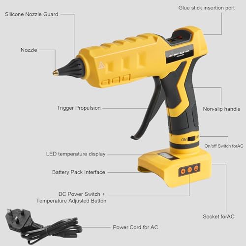 - Dual Power Supply – Cordless or Plug-In:The glue gun is compatible with Dewalt 18V batteries (DCB182, DCB183, DCB185, DCB206, DCB606, DCB609) and can also be connected to mains power for continuous use during extended working sessions.