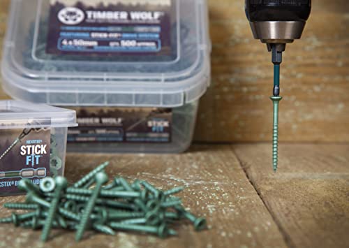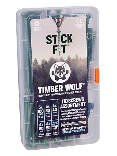 • 110 Timber Wolf Stick-Fit Exterior Woodscrews in a handy pocket assortment case. Pack Contents: 4.0 x 40mm (35 pcs); 4.0 x 50mm (50 pcs); 5.0 x 80mm (15 pcs); 5.0 x 100mm (10 pcs), plus 2x Stick-Fit driver bits.